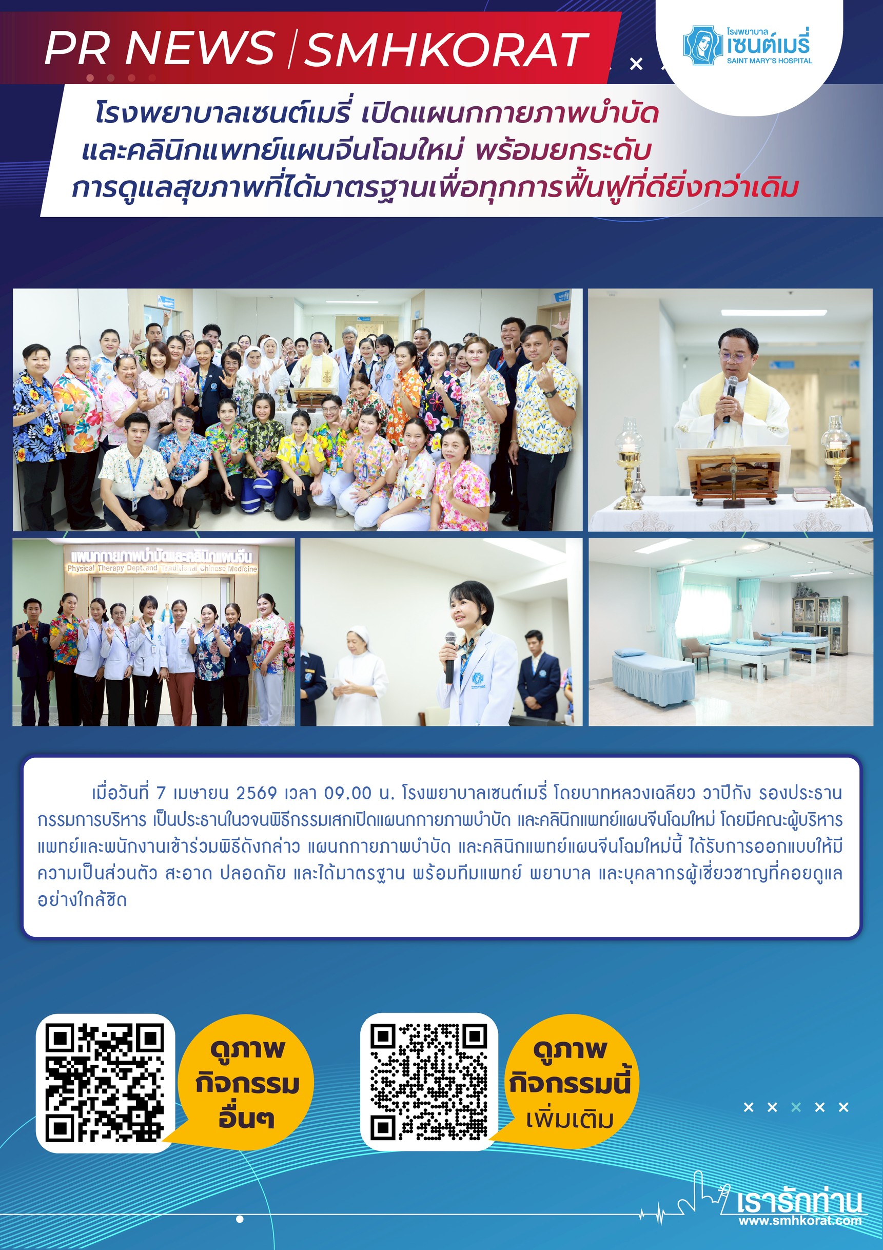 โรงพยาบาลเซนต์เมรี่ เปิดแผนกกายภาพบำบัดและคลินิกแพทย์แผนจีนโฉมใหม่ พร้อมยกระดับการดูแลสุขภาพที่ได้มาตรฐานเพื่อทุกการฟื้นฟูที่ดียิ่งกว่าเดิม
